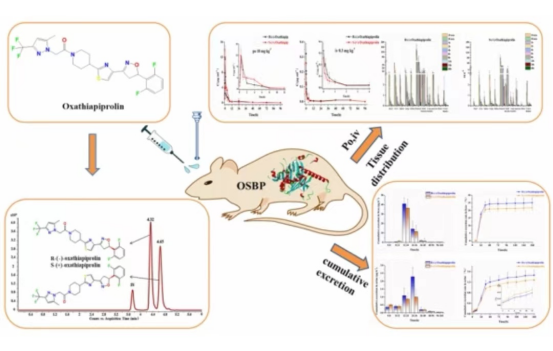 氟噻唑吡乙酮Oxathiapiprolin是一种手性杀菌剂,通过抑制氧固醇结合蛋白(OSBP)影响胆固醇类化合物的代谢,发挥杀菌作用。氟噻唑吡乙酮在农业中的应用十分广泛,其在环境中的残留对人类和动物的健康都有可能构成威胁。两种氟噻唑吡乙酮对映体的杀菌活性、生物毒性和环境中的降解不同。然而,它们在动物身上的生物毒性尚未见报道。手性农药的毒代动力学应该是评估体内毒性的关键组成部分,为农药的安全性评价提供科学依据。在本研究中,研究了两种氟噻唑吡乙酮对映体在大鼠体内的吸收、生物利用度、组织分布和排泄,来验证它们在动物体内的毒代动力学过程。建立了一种超高效液相色谱三重四极杆串联质谱(UHPLC-QQQ/MS)方法,用于在体内对两种氟噻唑吡乙酮对映体进行定量测定。研究发现这两种氟噻唑吡乙酮对映体具有大致相同的口服吸收和生物利用度,并且二者都主要通过粪便排泄。R-(-)-oxathiapiprolin的半衰期几乎是S-(+)-oxathiapiprolin的两倍。R-(-)-oxathiapiprolin在肝脏、肺、心脏、脾脏、肾脏、胃、大肠、小肠、脑和胰腺中的分布也比S-(+)-oxathiapiprolin更广泛,这也说明了R-(-)-oxathiapiprolin可以更好地与OSBP结合,S-(+)-oxathiapiprolin在这些组织中的立体选择性可能是其在体内容易代谢的原因。随后,利用分子对接技术验证了R-(-)-oxathiapiprolin和OSBP之间的结合比S-(+)-oxathiapiprolin和OSBP之间的结合更牢固。本研究结果可为确定氟噻唑吡乙酮单一对映体在动物体内的毒代动力学提供更T-可靠的数据,从而为其后续毒理学研究提供一定的理论依据。