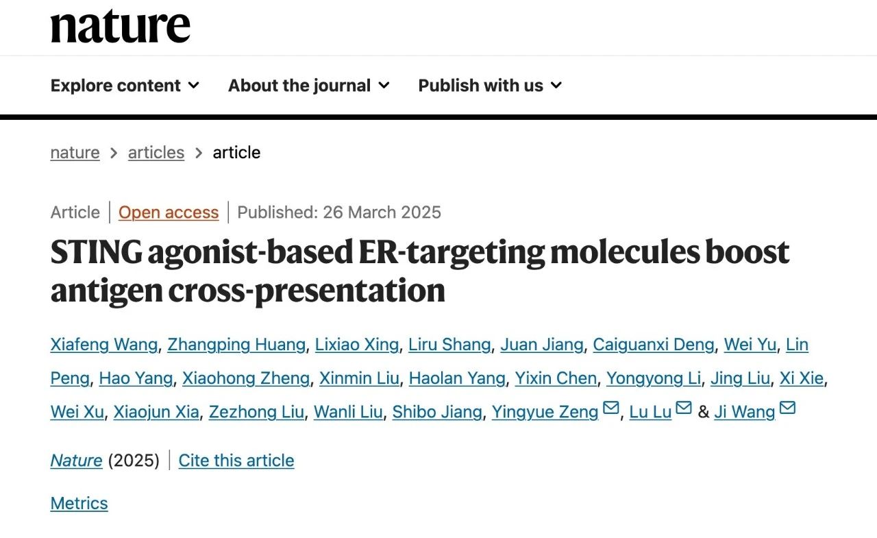2025年3月27日,国产一区二区日本在线生命科学院曾颖玥副教授与中山大学附属第一医院王骥研究员、复旦大学陆路研究员的合作研究论文STING agonist-based ER targeting molecules boost antigen cross-presentation在国际顶级期刊《自然》(Nature)上在线发表,曾颖玥副教授为本文共同通讯作者。